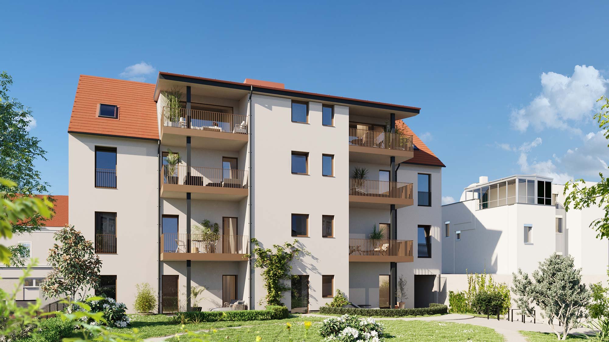 Geplant sind 13 Wohnungen mit Größen zwischen ca. 38 und 97 m², die meisten mit Balkon und Zugang zu großzügigen Grün- und Gemeinschaftsflächen. Eine Baureserve am Grundstück ermöglicht zudem zukünftige Erweiterungen.